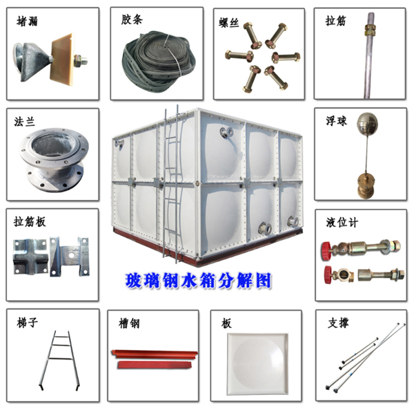 5、 玻璃鋼消防水箱標準配件包括:進水管法蘭,出水管法蘭,溢流管法蘭,污水管法蘭,通風孔,人孔,內外梯等。所有開口位置均可在現場指定,但相關管道路徑和數量,用戶在訂購時應提前指定;